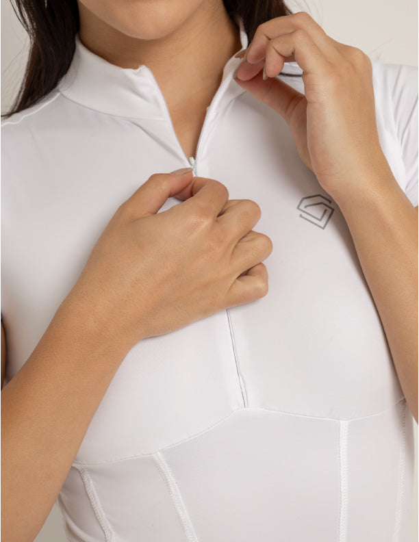 El vestido deportivo tipo corset blanco combina diseño moderno y funcionalidad para quienes buscan rendimiento sin perder estilo. Su cierre frontal asegura un ajuste cómodo y práctico, mientras que la falda short integrada brinda libertad de movimiento y confianza en cada paso. Con un cuello ligeramente estilo tortuga, este vestido aporta un toque sofisticado que lo diferencia de las prendas deportivas tradicionales.